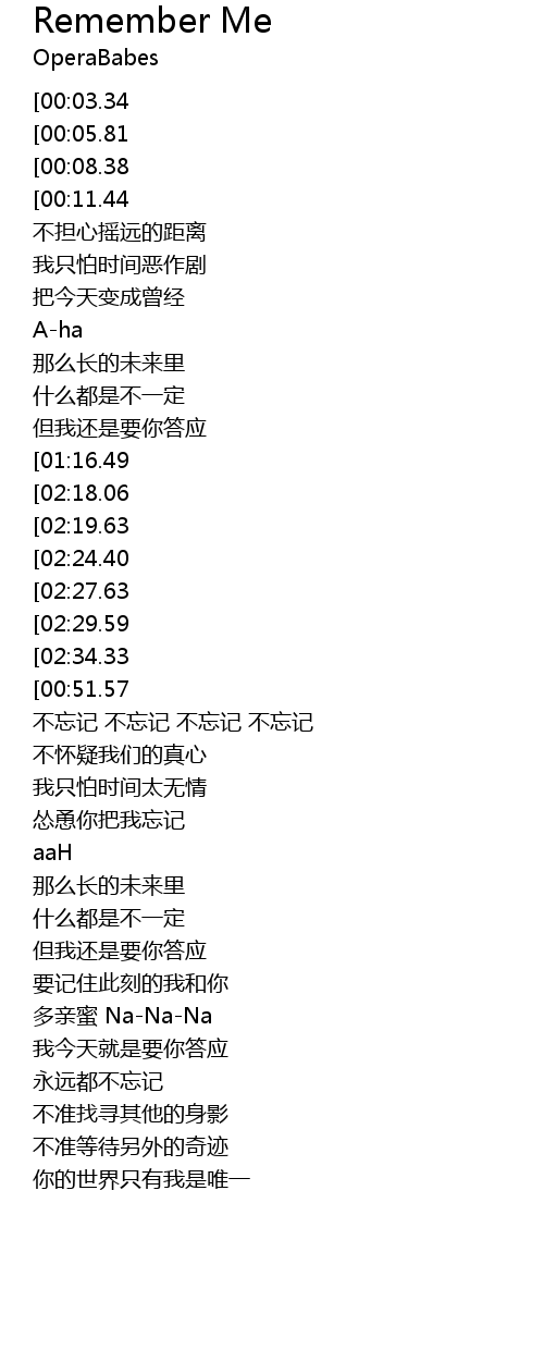 | [02:49.63][02:29.59][01:29.53][00:44.40] | remember my eyes,my smile,my soul |