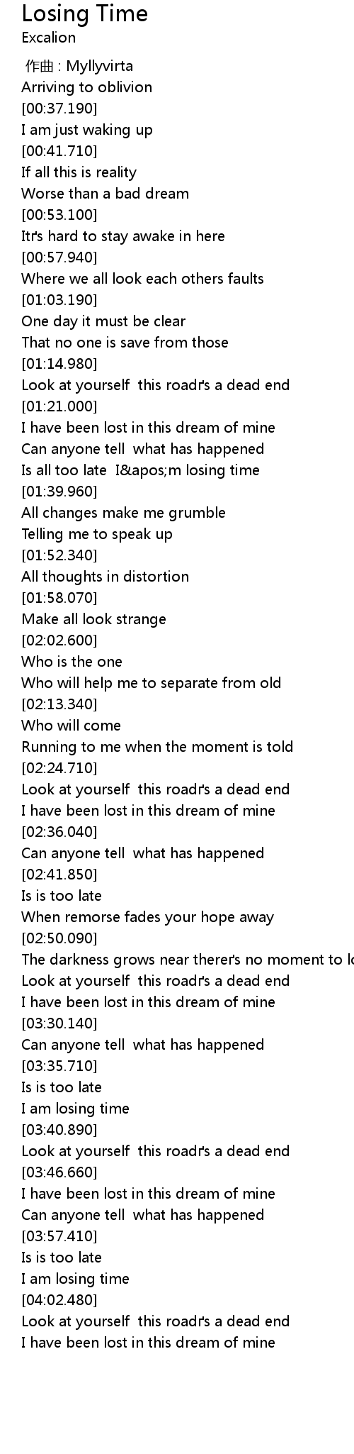 | [01:32.380] | Is all too late I apos m losing time |