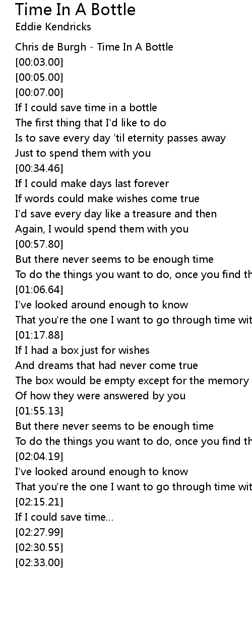 | [00:01.00] | Chris de Burgh Time In A Bottle |