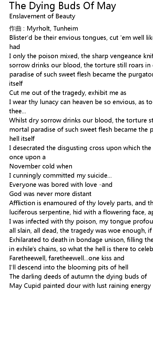 | I only the poison mixed, the sharp vengeance knife, the suicide whilst dry sorrow drinks our blood, the torture still roars in dismal hell the mortal paradise of such sweet flesh became the purgatory, indeed the very hell itself | |
