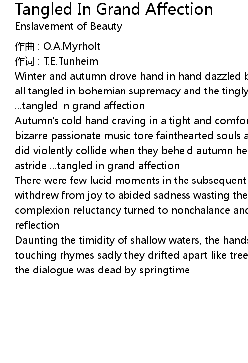 | Autumn' s cold hand craving in a tight and comforting response while their bizarre passionate music tore fainthearted souls apart the narrow minded seasons did violently collide when they beheld autumn hellishly situated on winter astride ... tangled in grand affection | |