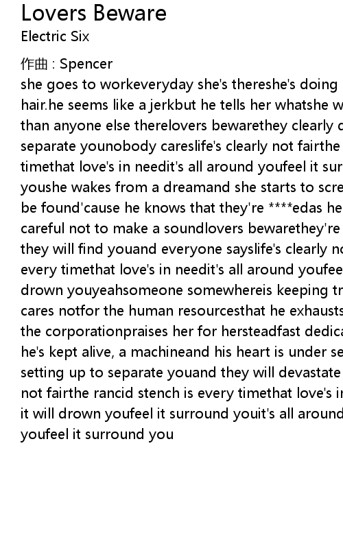 | she goes to workeveryday she' s thereshe' s doing somethingdifferent with her hair. he seems like a jerkbut he tells her whatshe wants to hear andthat' s more than anyone else therelovers bewarethey clearly don' t appreciate youthey want to separate younobody careslife' s clearly not fairthe rancid stench is every timethat love' s in needit' s all around youfeel it surround youand it will drown youshe wakes from a dreamand she starts to scream his namebut he is nowhere to be found' cause he knows that they' re edas he hides inside the heating ductbe careful not to make a soundlovers bewarethey' re very good at what they doand they will find youand everyone sayslife' s clearly not fairthe rancid stench is every timethat love' s in needit' s all around youfeel it surround youand it will drown youyeahsomeone somewhereis keeping track ofwhatever pencil causebut he cares notfor the human resourcesthat he exhaustsnow she' s receiving a raiseand the corporationpraises her for hersteadfast dedicationhis conscience is cleanand he' s kept alive, a machineand his heart is under sedationlovers bewarethey were setting up to separate youand they will devastate younobody careslife' s clearly not fairthe rancid stench is every timethat love' s in needit' s all around youand it will drown youfeel it surround youit' s all around youand it will drown youfeel it surround you |