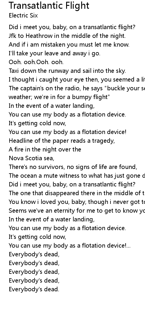 The captain's on the radio, he says "buckle your seat tight""there's nasty weather; we're in for a bumpy flight" |