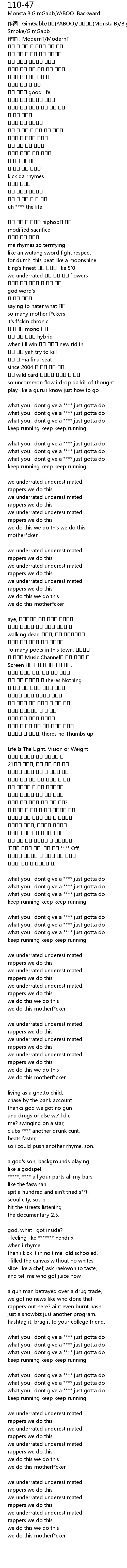 | 作词 : GimGabb/야부(YABOO)/몬스타비(Monsta.B)/Big Smoke/Big Smoke/GimGabb | |