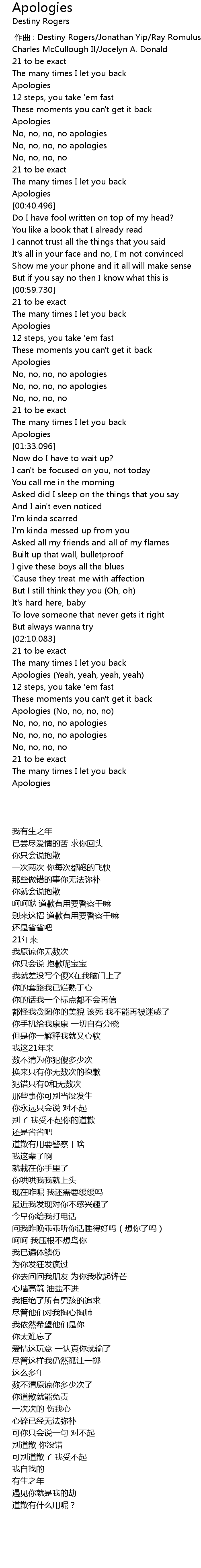 | [02:14.664] | Apologies (Yeah, yeah, yeah, yeah) |