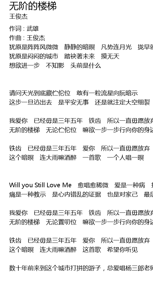 | wú jiē de lóu tī wú lùn zhù tuó wèi ma yù yī bù yī bù xíng xiàng nǐ de shēn biān | |