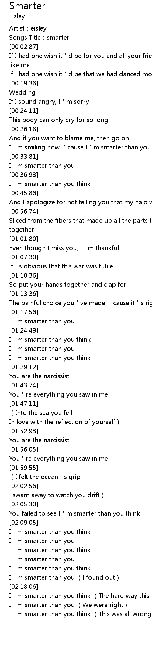 | [02:21.68] | I'm smarter than you think (This was all wrong) |