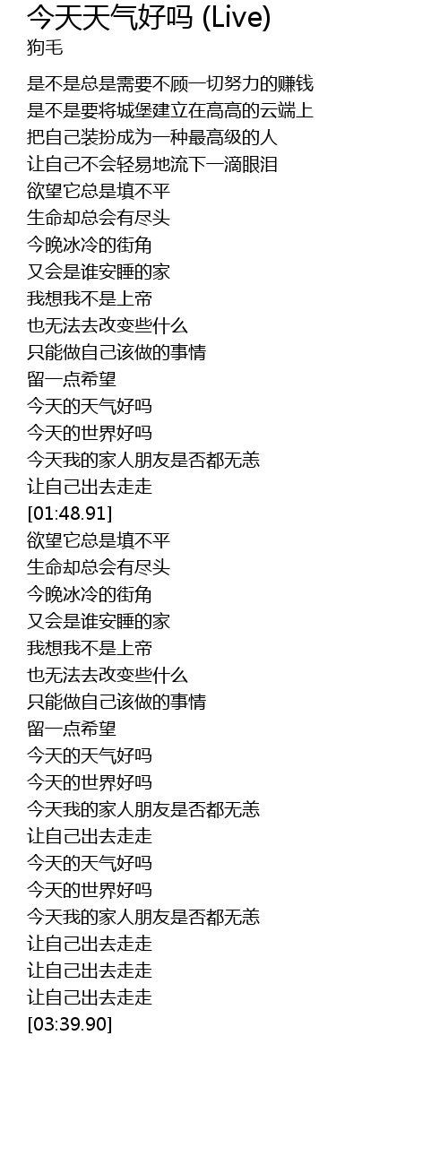 | [03:02.33] | jīn tiān de tiān qì hǎo ma |