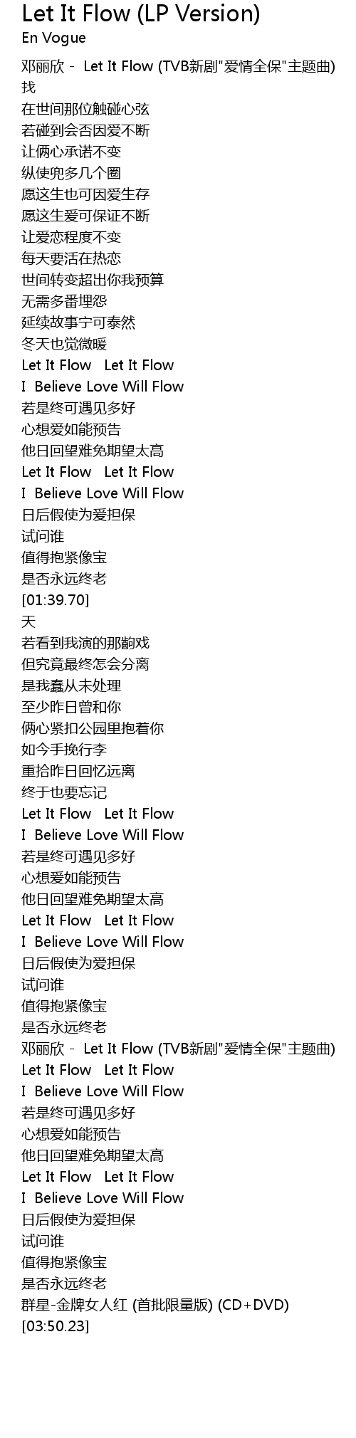 | [02:52.75] | 邓丽欣 - Let It Flow (TVB新剧"爱情全保"主题曲) |