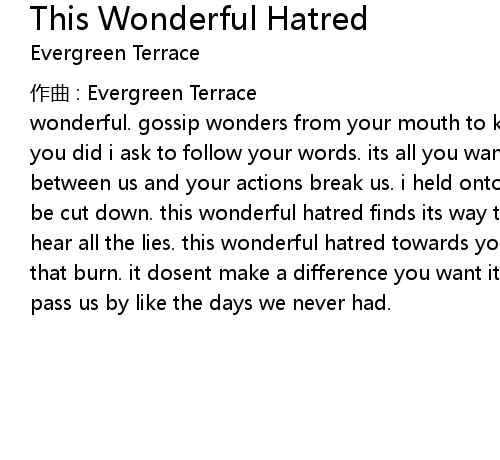 | wonderful. gossip wonders from your mouth to kiss the ground. did i ask to see you did i ask to follow your words. its all you want to know. you let this come between us and your actions break us. i held onto everyone of your words just to be cut down. this wonderful hatred finds its way to me and in your tone i can hear all the lies. this wonderful hatred towards your words are like the embers that burn. it dosent make a difference you want it all. they turn to ashes and pass us by like the days we never had. |