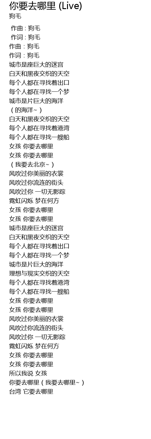 | [01:15.12] | 女孩 你要去哪里 |