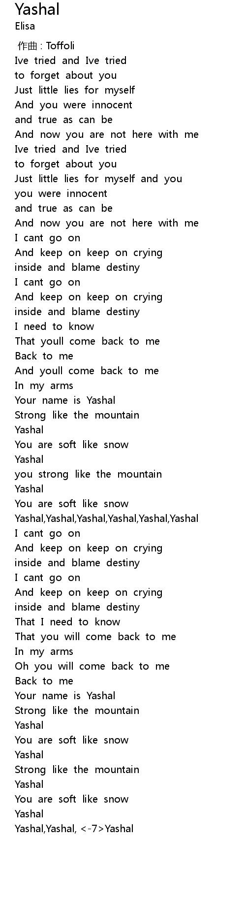 | [02:51.94] | Yashal, Yashal, Yashal, Yashal, Yashal, Yashal |