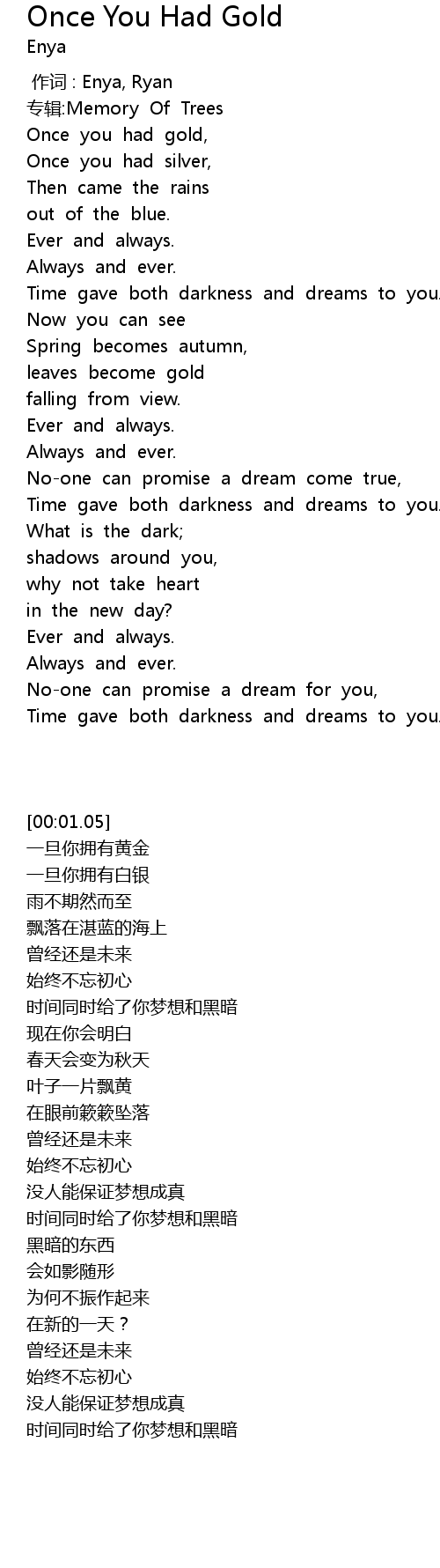 | [00:00.00] | 作词 : Enya, Ryan |