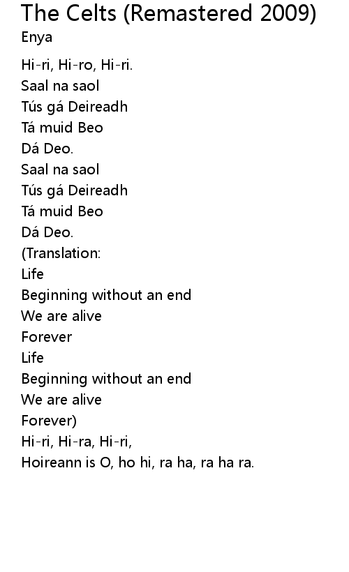 | [02:45.360] | Hoireann is O, ho hi, ra ha, ra ha ra. |