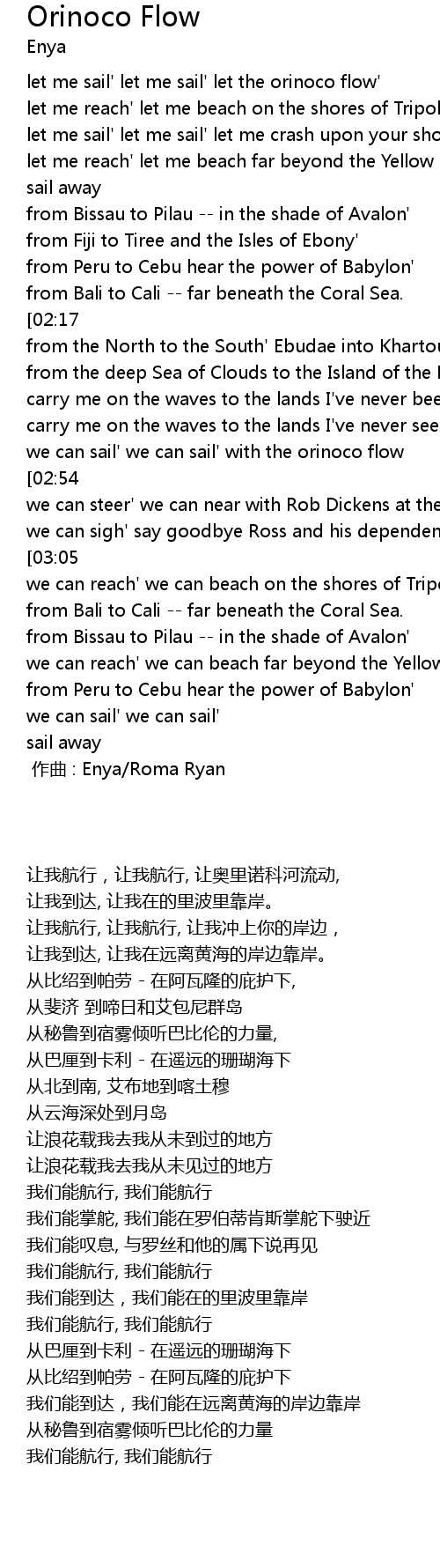 | [00:16] | let me sail' let me sail' let the orinoco flow' |