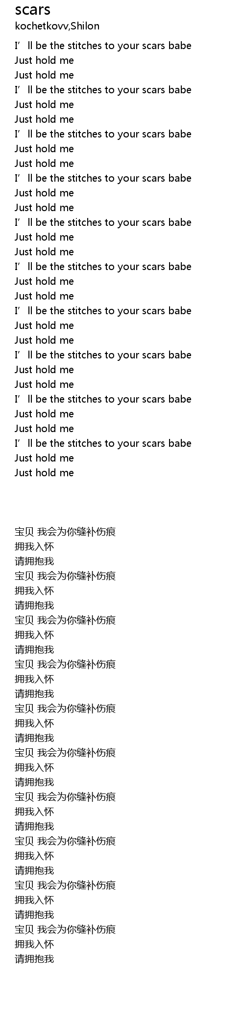 | [00:31.72] | I' ll be the stitches to your scars babe |