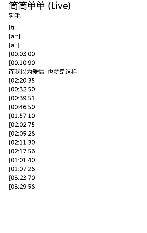 | [03:18.00][02:20.35][01:51.83][00:56.60][00:28.60] | 简简单单 |