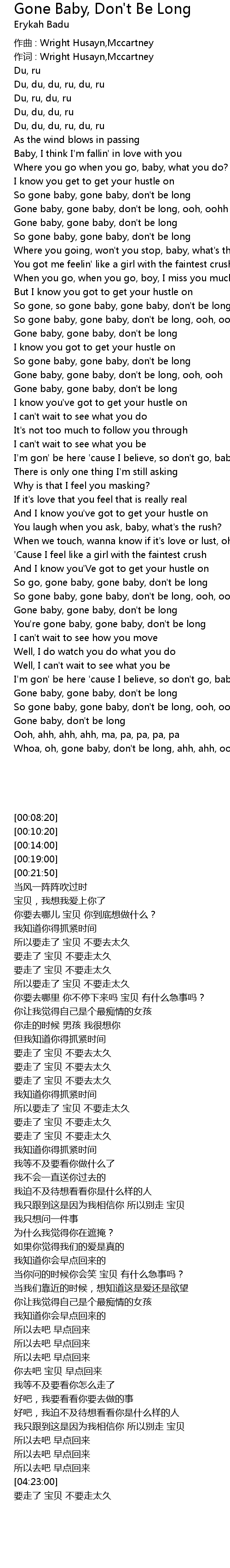 | Gone baby, gone baby, don' t be long, ooh, oohh | |