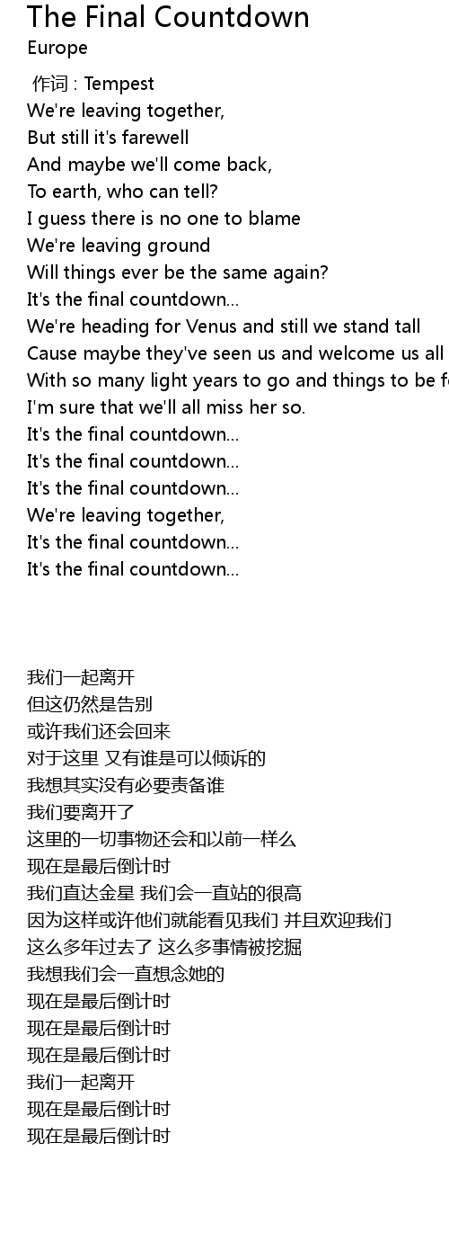 | [01:57.660] | It' s the final countdown... |