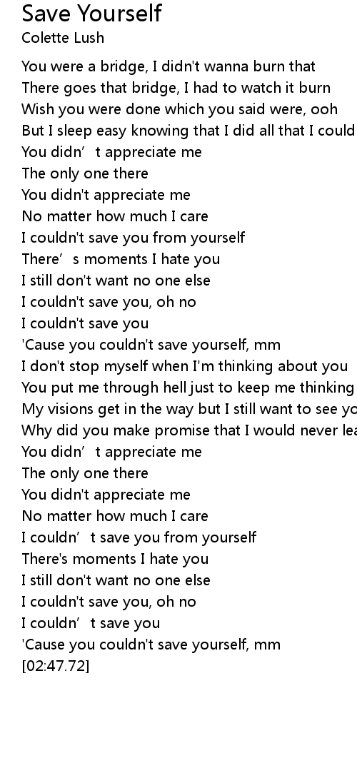 | [01:15.11] | ' Cause you couldn' t save yourself, mm |