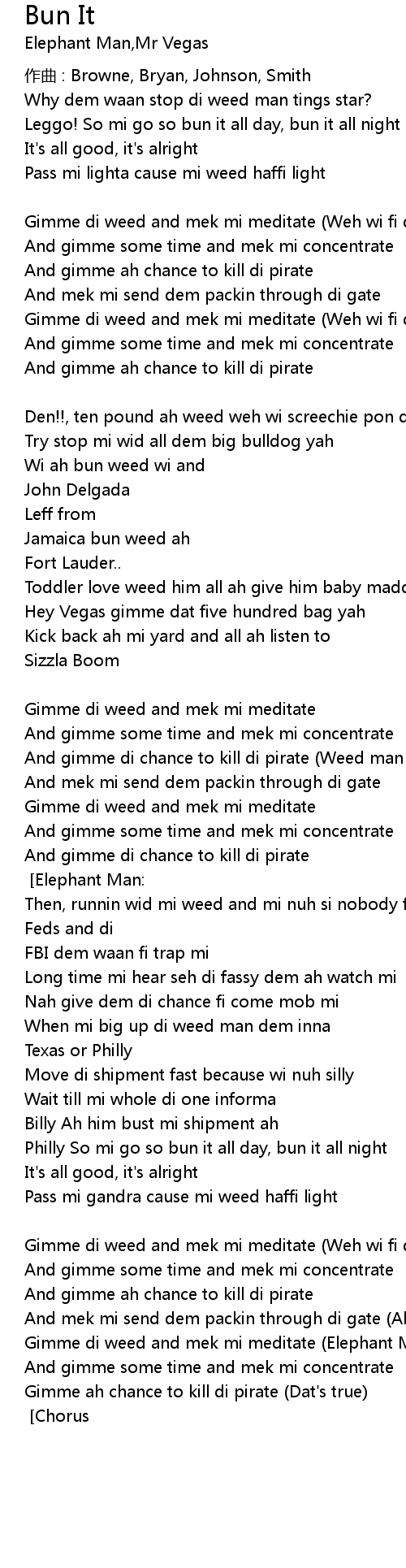 | All di weed man dem tonight so mi sing, ay! Chorus: Mr. Vegas Elephant Man | |