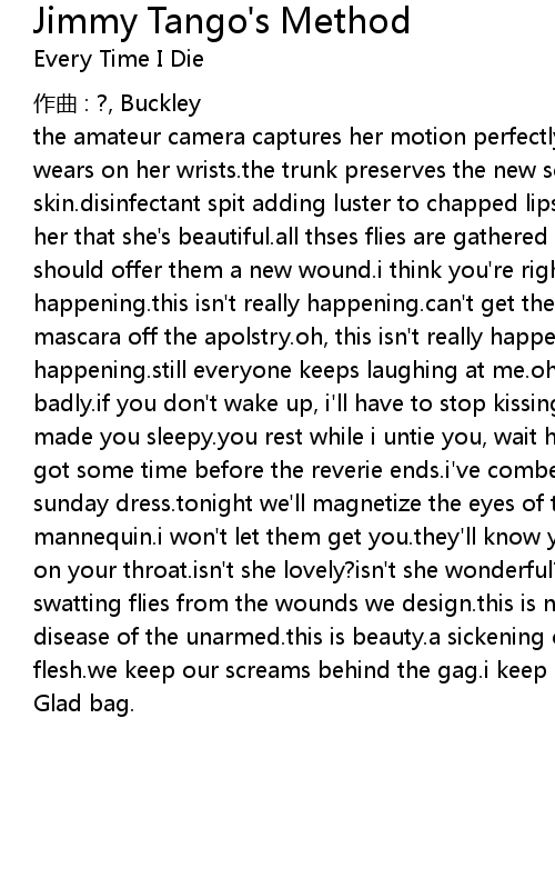 | the amateur camera captures her motion perfectly. as the strangle knot that she wears on her wrists. the trunk preserves the new scent of the princess skin. disinfectant spit adding luster to chapped lips. if she comes to, i' ll tell her that she' s beautiful. all thses flies are gathered in admiration. perhaps we should offer them a new wound. i think you' re right, this isn' t really happening. this isn' t really happening. can' t get the smell out, can' t get the mascara off the apolstry. oh, this isn' t really happening, this isn' t really happening. still everyone keeps laughing at me. oh god, this is going to end badly. if you don' t wake up, i' ll have to stop kissing you. all that flailing has made you sleepy. you rest while i untie you, wait here until they find you. we' ve got some time before the reverie ends. i' ve combed my hair, brought you your sunday dress. tonight we' ll magnetize the eyes of this whole town. my hand made mannequin. i won' t let them get you. they' ll know you' re mine by the fingerprints on your throat. isn' t she lovely? isn' t she wonderful? like the whores that we are, swatting flies from the wounds we design. this is not about fear. paranoia is a disease of the unarmed. this is beauty. a sickening concern for the transcience of flesh. we keep our screams behind the gag. i keep my baby' s breath in a | |