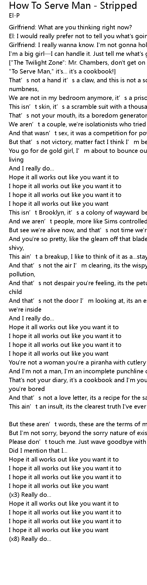 | El: I would really prefer not to tell you what' s going on in my head right now. | |
