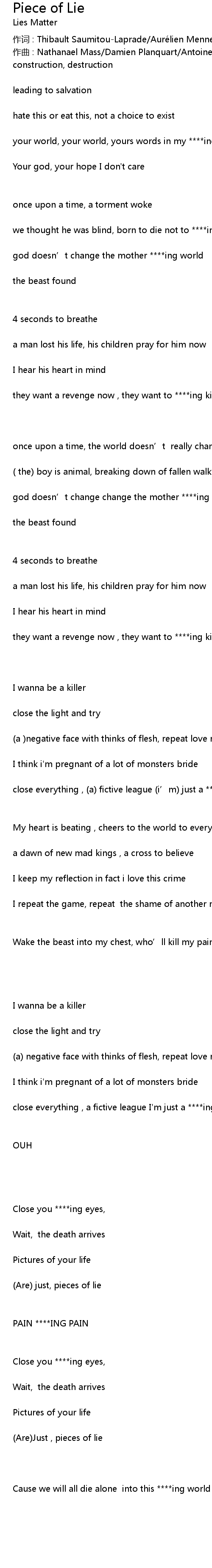 | close everything , (a) fictive league (i’m) just a ****ing piece of lie | |