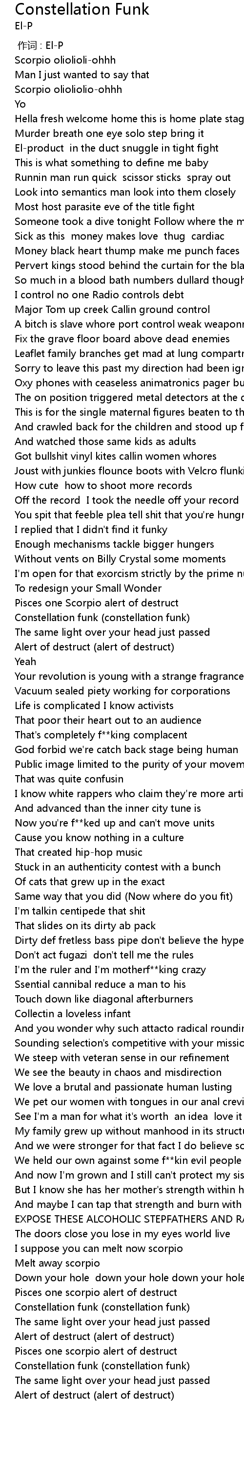 | [01:50.62] | Pisces one Scorpio alert of destruct |