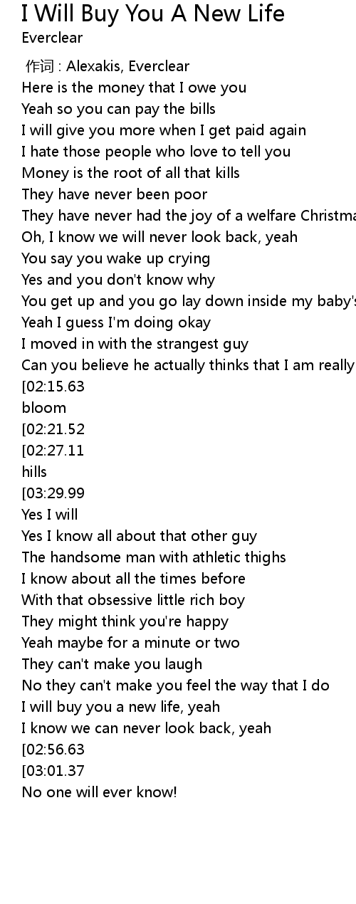 | [03:33.64][03:29.99][03:24.21][02:37.88][01:41.55] | I will buy you a new life |