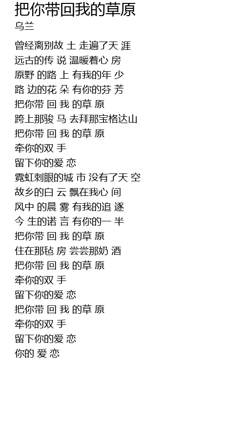 | [01:11.740] | 把你带 回 我 的草 原 |
