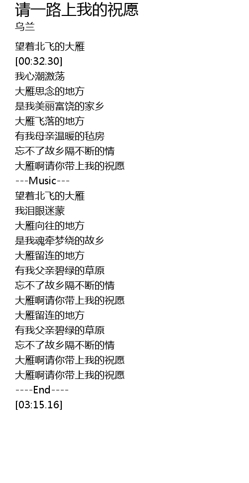 | [02:55.32] | 大雁啊请你带上我的祝愿 |