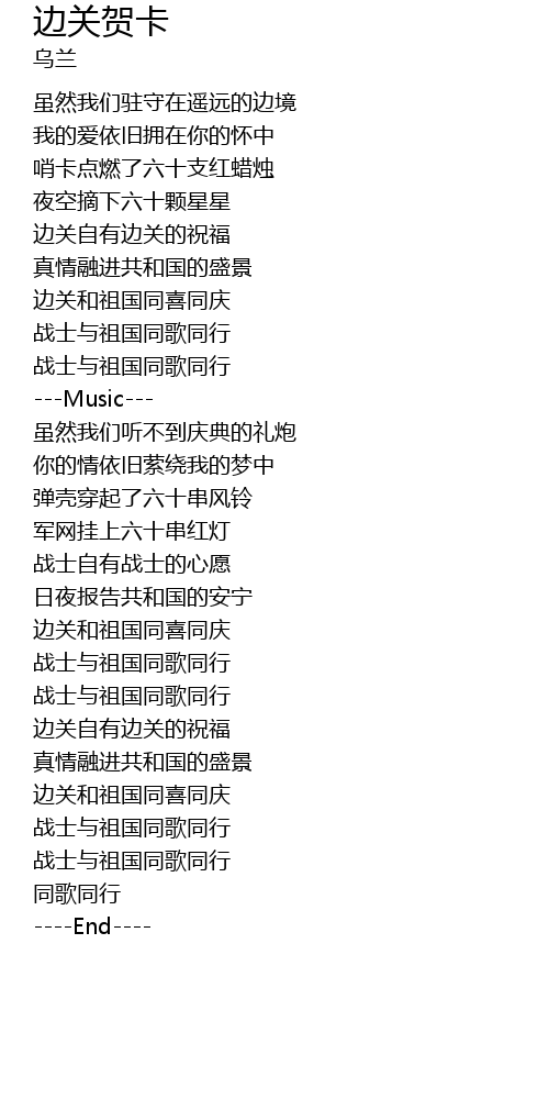| [01:31.13] | 边关和祖国同喜同庆 |
