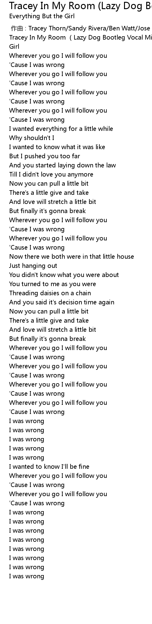 | [00:00.160] | Tracey In My Room Lazy Dog Bootleg Vocal Mix Everything But The Girl |
