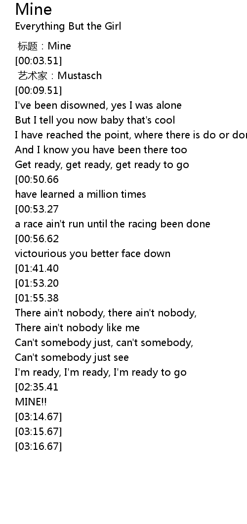 | [00:59.42][01:53.20][02:59.70][03:11.62] | Mine, mine, mine |