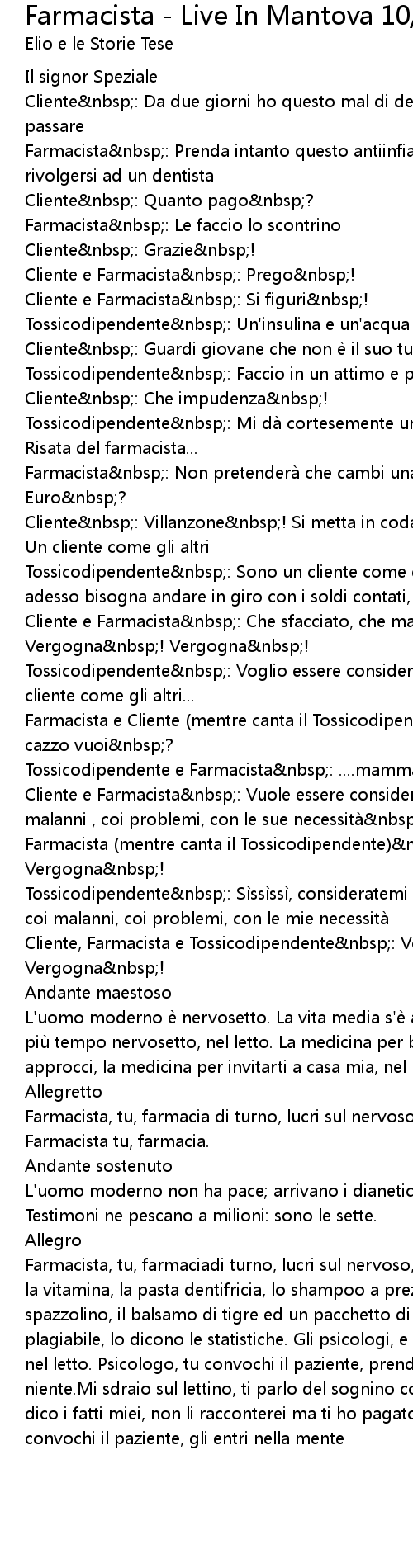 | Farmacista, tu, farmacia di turno, lucri sul nervoso, lucri notte e giorno. Farmacista tu, farmacia. | |
