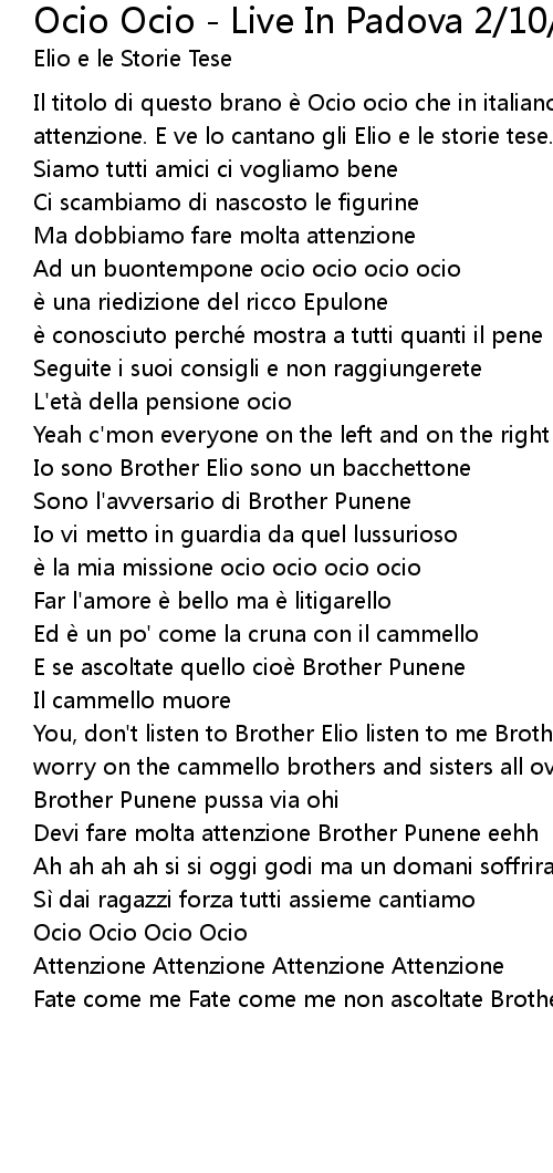 | Il titolo di questo brano è Ocio ocio che in italiano vuol dire Attenzione attenzione. E ve lo cantano gli Elio e le storie tese. | |