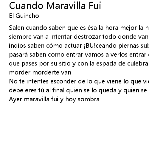 | Salen cuando saben que es é sa la hora mejor la hora y el camino cuentan con que siempre van a intentar destrozar todo donde van algo nuevo va a pasar con los indios saben có mo actuar BU! ceando piernas suben por las calles donde nadie pasará saben como entrar vamos a verlos entrar con las alas preparadas esperan que pases por su sitio y con la espada de culebra en el desvá n a morderte van a morder morderte van | |