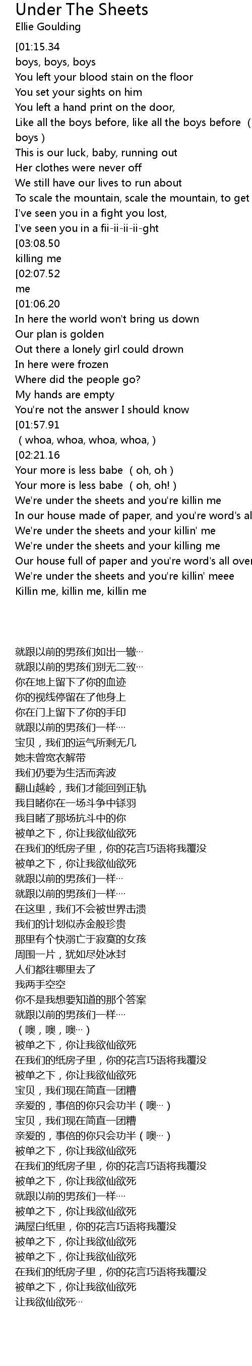 | [03:17.62][03:08.50][02:02.48][00:56.75] | We're under the sheets and you're killing me |