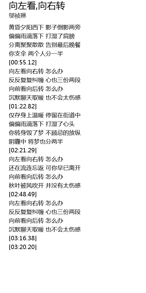 | [00:55.58] | xiàng zuǒ kàn xiàng yòu zhuǎn zěn me bàn |