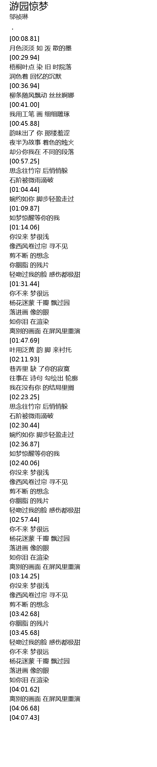 | [03:33.87] | nǐ méi lái mèng hěn qiǎn |