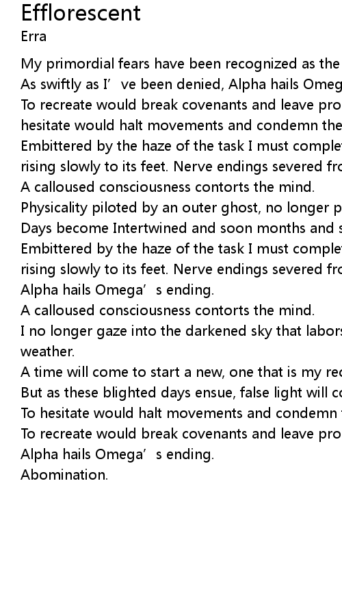 | As swiftly as I' ve been denied, Alpha hails Omega' s ending. | |