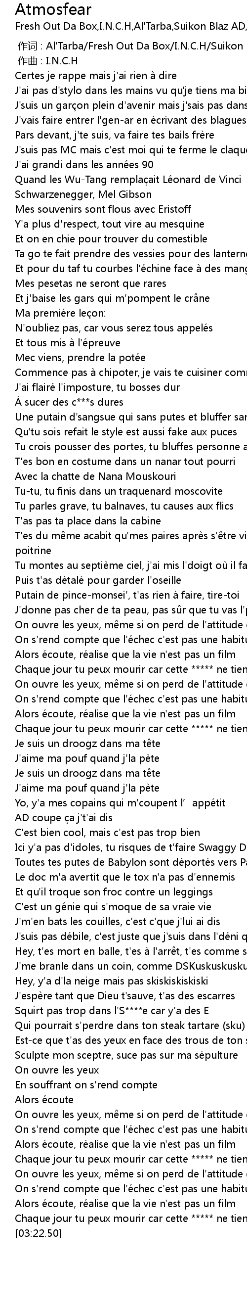 | [03:19.72] | Chaque jour tu peux mourir car cette ***** ne tient qu'à un fil |