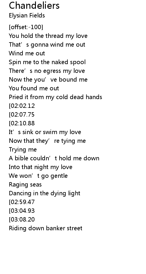 | [00:57.04][02:02.12][02:47.88] | You got me swinging chandeliers |