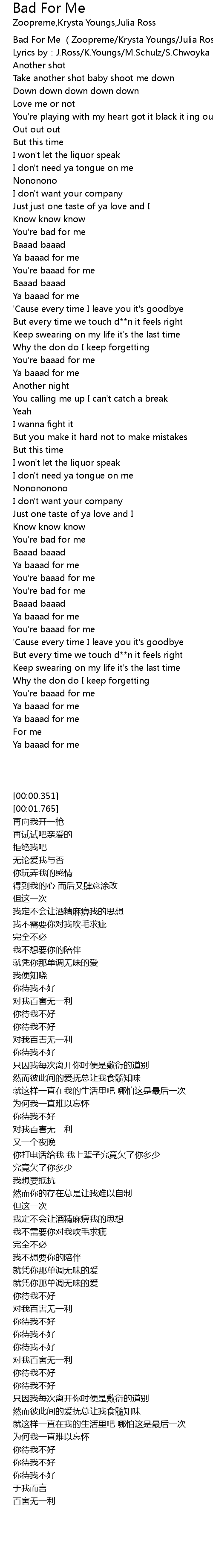 | [00:00.351] | Bad For Me (Zoopreme/Krysta Youngs/Julia Ross |