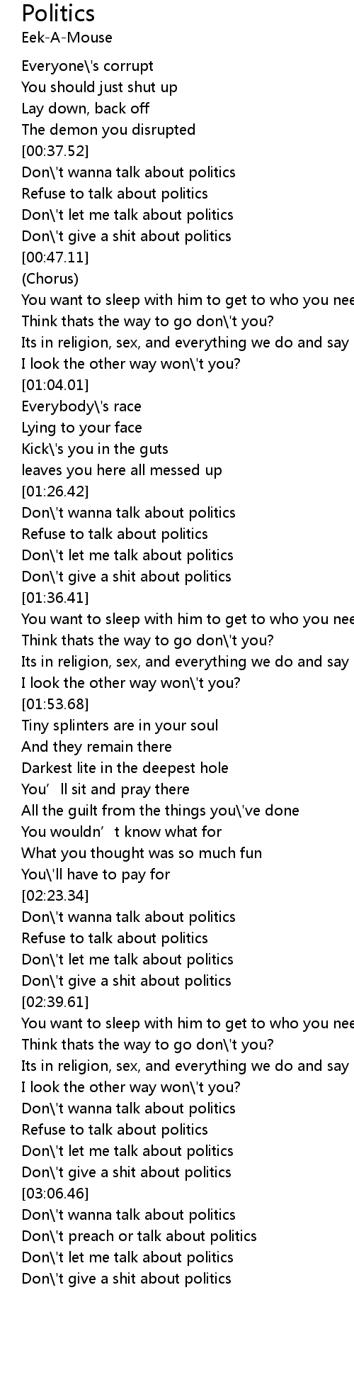 | [03:04.65] | Don\'t give a shit about politics |