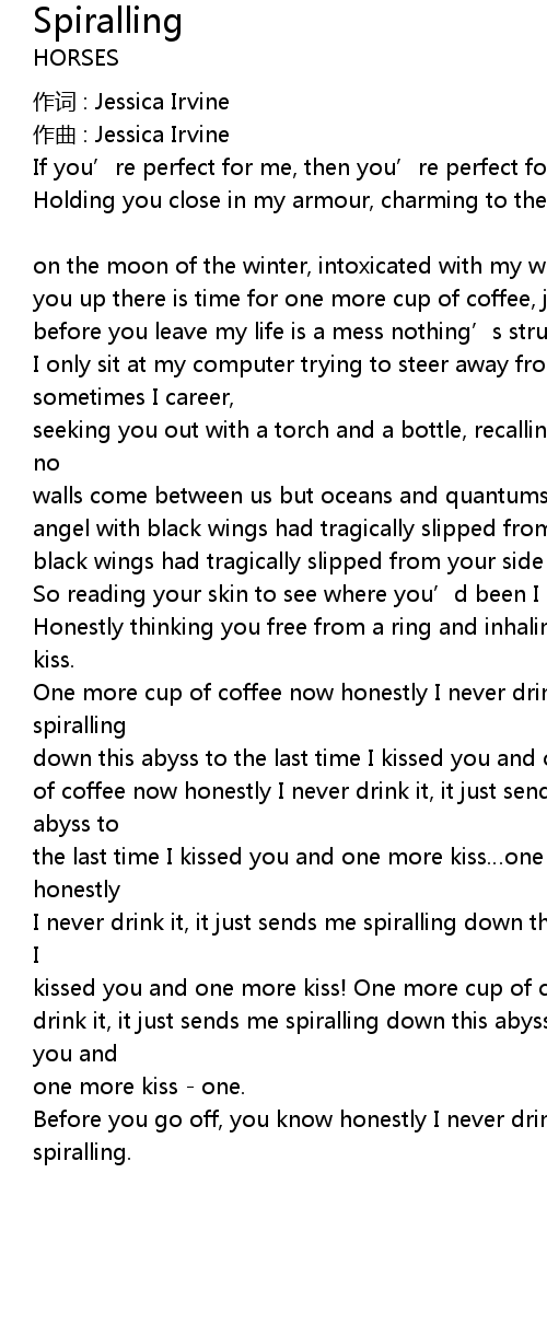 | down this abyss to the last time I kissed you and one more kiss one more cup of coffee now honestly I never drink it, it just sends me spiralling down this abyss to | |