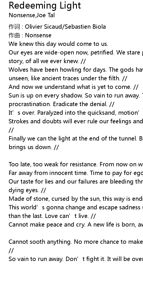 | Cannot sooth anything. No more chance to make amends. Time fo face the unknown. | |