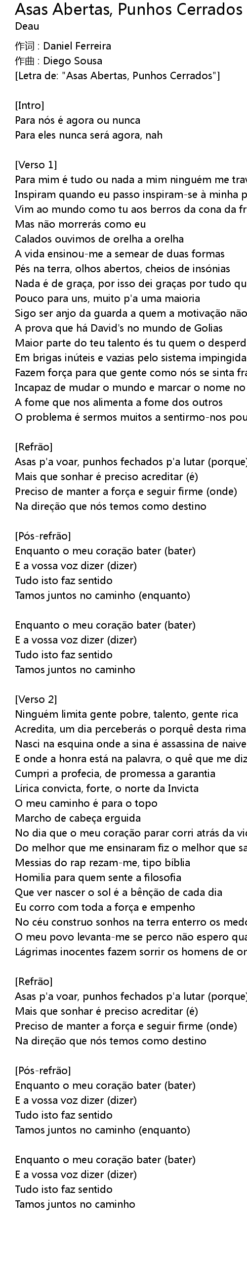 | [Letra de: "Asas Abertas, Punhos Cerrados"] | |
