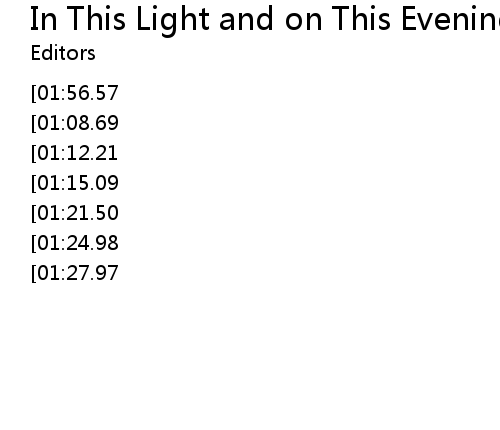 | [02:13.37][01:21.50][00:29.49] | In this light and on this evening |